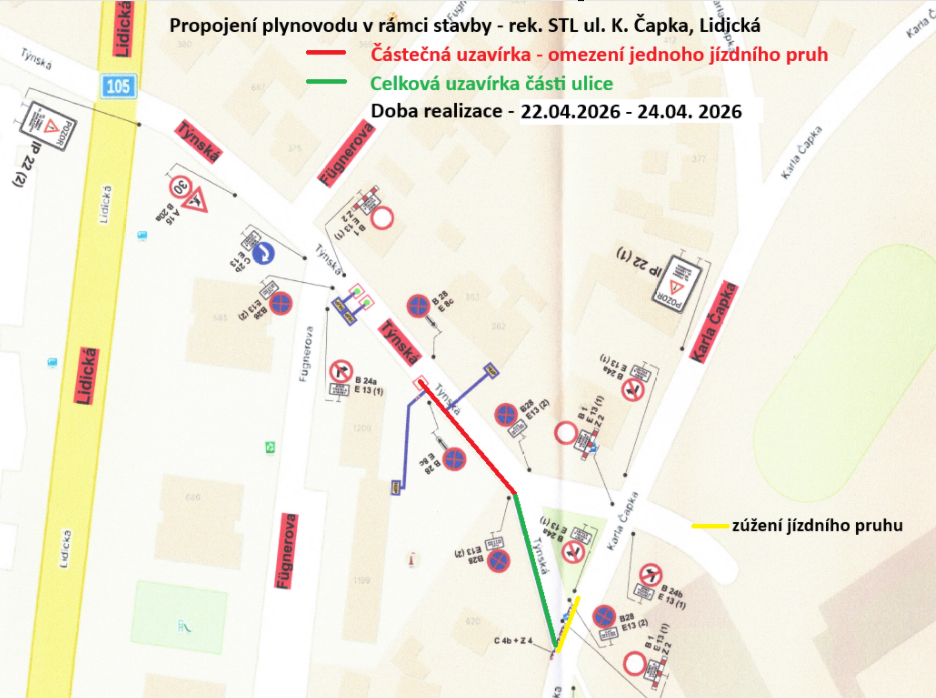 Z důvodu rekonstrukce plynovodu v ulicích Karla Čapka a Týnská dojde v termínu 22.04.2026 - 24.04.2026 k dopravnímu omezení u ZŠ. Mapa je ZDE